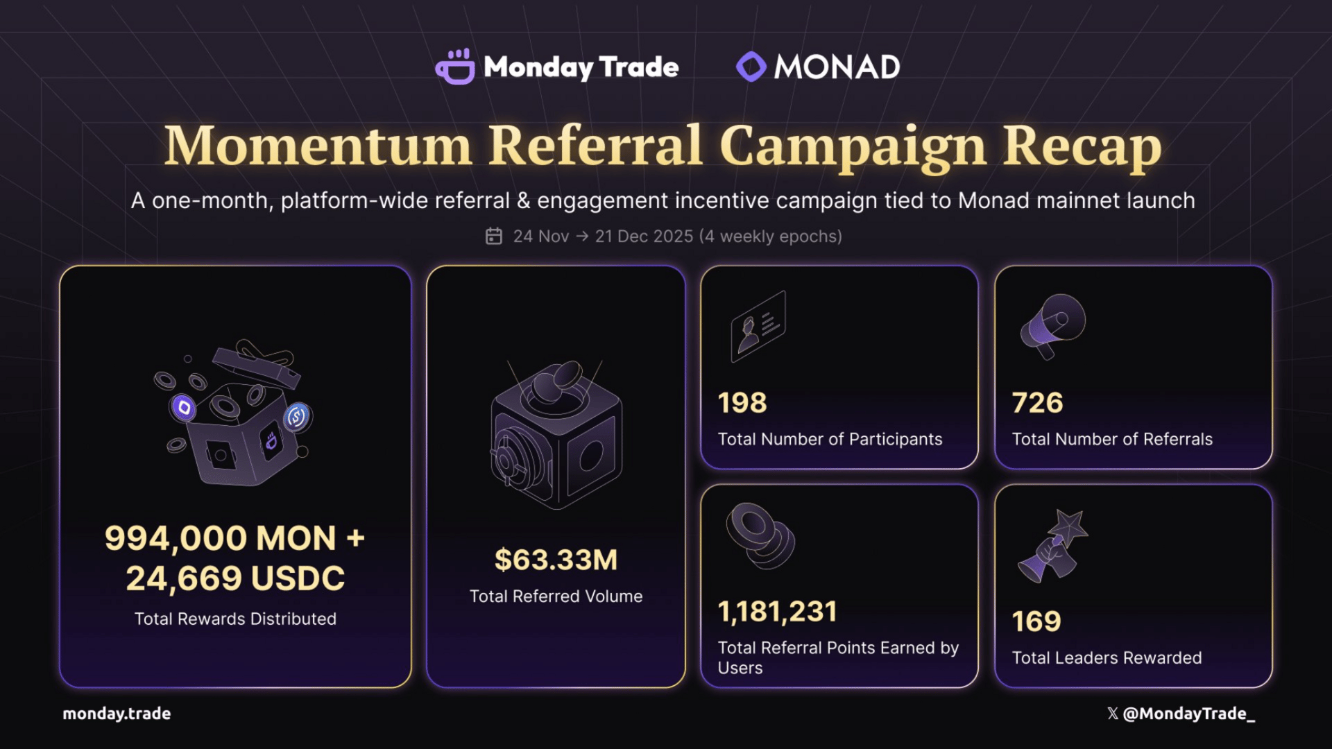 December was about learning, stabilizing, and preparing for what comes next. With mainnet live, campaigns tested, and real usage data in hand, Monday Trade is heading into 2026 focused on: